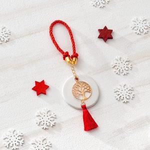 Χριστουγεννιάτικο ξύλινο διακοσμητικό παραλληλόγραμμο καδράκι σε λευκό χρώμα. Το καδράκι στο εσωτερικό είναι ζωγραφισμένο με πράσινες χριστουγεννιάτικες μπάλες και στο εξωτερικό είναι διακοσμημένο με σύνθεση από στάχια και μεταλλικό γούρι.