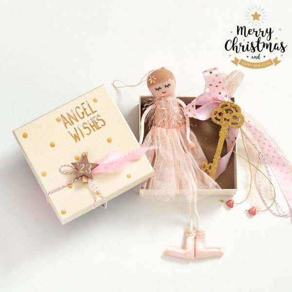 Χριστουγεννιάτικο σετ δώρου σε χάρτινο εκρού κουτί Angel wishes Μέσα περιλαμβάνει κοριτσάκι με σομόν τούλινο φόρεμα και κρεμαστό με ξύλινο κλειδί. Το καπάκι είναι στολισμένο με κορδόνι, ξύλινο μανταλάκι αστεράκι ’23 και φτερό.