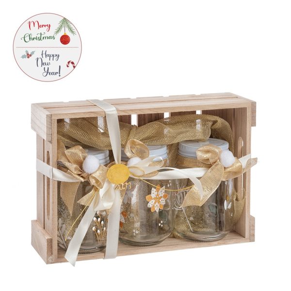 Χριστουγεννιάτικο σετ δώρου σε natural καφάσι. Περιλαμβάνει 3 γυάλινες κούπες, ζωγραφισμένες σε χρυσές-λευκές αποχρώσεις. Είναι στολισμένο με lurex ύφασμα και κορδέλες σε λευκό-χρυσό χρώμα.